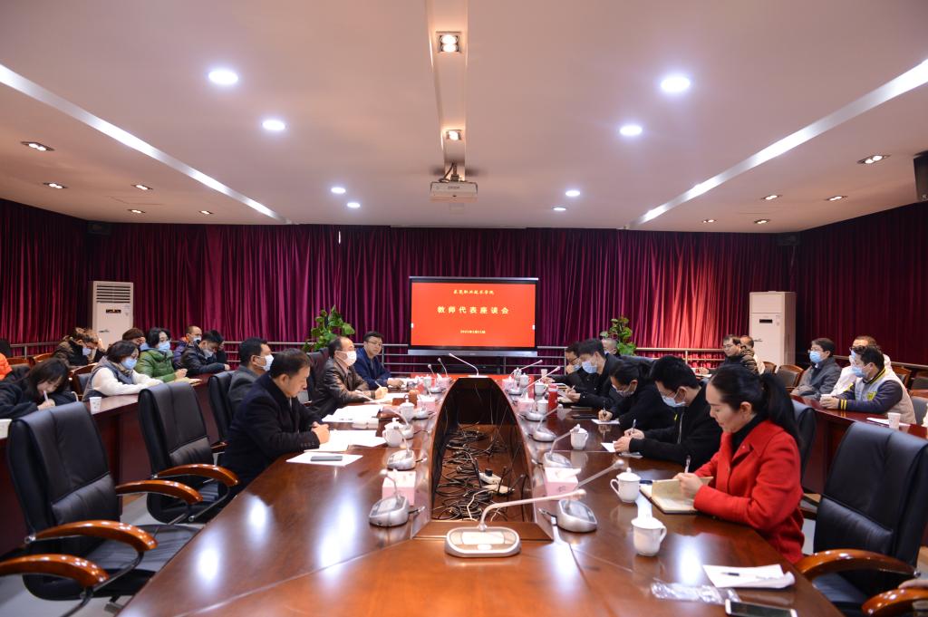 1月11日下午,我校在行政楼B415会议室召开教师代表座谈会,畅谈我校2020年的各项工作,谋划2021年重点工作,群策群力,共同推动学校发展。我校党委书记朱益民,党委副书记、校长贺定修,党委委员、副校长杨云奇出席座谈会,相关部门负责人以及各院系38名教师代表参加座谈会。
