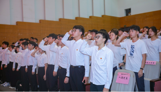 伴随着庄严的国歌声,2021年新团员入团仪式拉开序幕。各院(系)团总支书为2021年新团员代表颁发团章、团员证、团徽。“我志愿加入中国共产主义青年团,坚决拥护中国共产党的领导,遵守团的章程,执行团的决议……”新团员代表带领全体新团员,面向鲜红的团旗,高举右拳,庄严宣誓。
