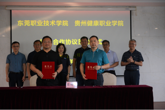 会上,贵州健康职业学院党委委员、副院长田勇与我校党委委员、副校长杨云奇签订了对口合作协议。贵州健康职业学院党委书记黄霞,党委副书记李黔军,党委委员、宣传统战部部长王家琪,我校党委书记朱益民,党委委员、党委宣传部部长杨洋,党委委员、教务处处长王志明共同在场鉴证。
