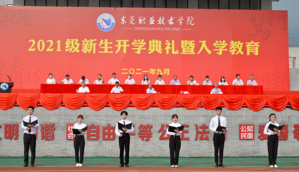 在雄壮庄严的国歌声中,典礼正式拉开帷幕。学校大学生艺术团主持队为大家送上配乐诗朗诵《党旗下》。2021级电子商务1班陈爽玲同学作为新生代表上台发言。她表示,东职是容纳大家梦想的天空,未来在东职的学习生活中,要培养自身的各项能力,积极参与各类实践活动,为学校的发展做出自己的贡献,也为实现梦想绽放自我。