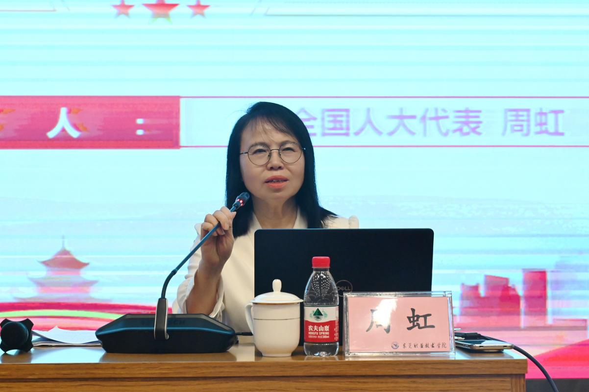 会上,周虹教授结合参会期间的亲身经历,传达了习近平总书记在两会期间系列重要讲话精神,解读了政府工作报告的核心要义,以及“十五五”规划纲要的战略部署,并介绍了广东代表团的主要活动和工作情况,分享了她在参会期间的所见所闻,让现场师生对今年两会精神有了更加直观、更加深刻的理解。