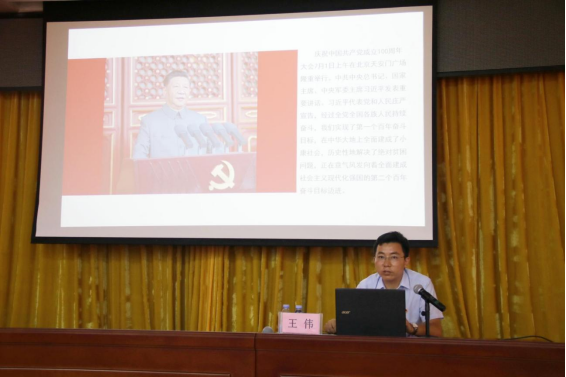 王伟老师以“百年党史中的‘七一’和‘七一’讲话”、“百年历程:一个主题与四大成就”、“百年精神:精神之源与精神谱系”和“百年密码:历史启示与行动纲领”四个章节为师生展现了中国共产党的百年辉煌历程,同时阐述了中国共产党必然取得成功的理论基础、精神根基等要点。